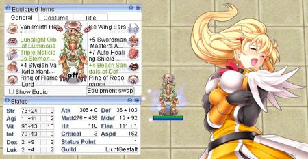 Extra: Este paladin tiene muy buen daño, si se desea mejorar el delay se deben usar armas con 3 Dancing Marionette berserk potion ayuda, la skill de la pet es importante porque podemos usar Energy coat, gracias al arma y accesorios pocas veces necesita sp al estar farmeando y pocas veces muere, el set shadow ayuda mucho y el sello de free cast premite reposicionar el Grand cross mientras se castea.